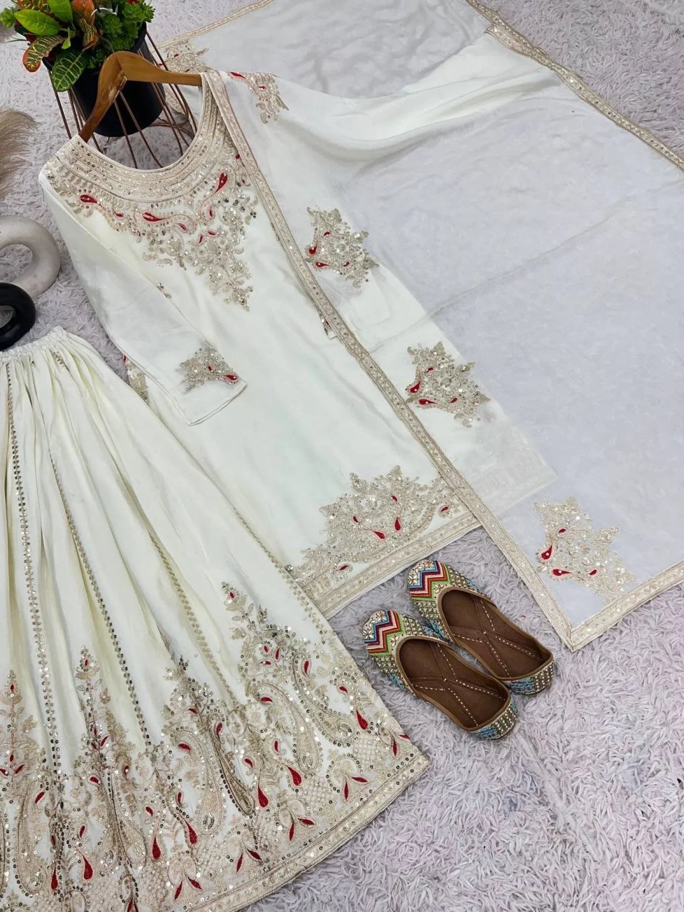 Elevate your party wardrobe with this stunning white salwar suit made from Pure Chinon Silk fabric, featuring intricate embroidery and sequence work. Perfect for parties, weddings, and festive occasions, this ensemble combines elegance with comfort.