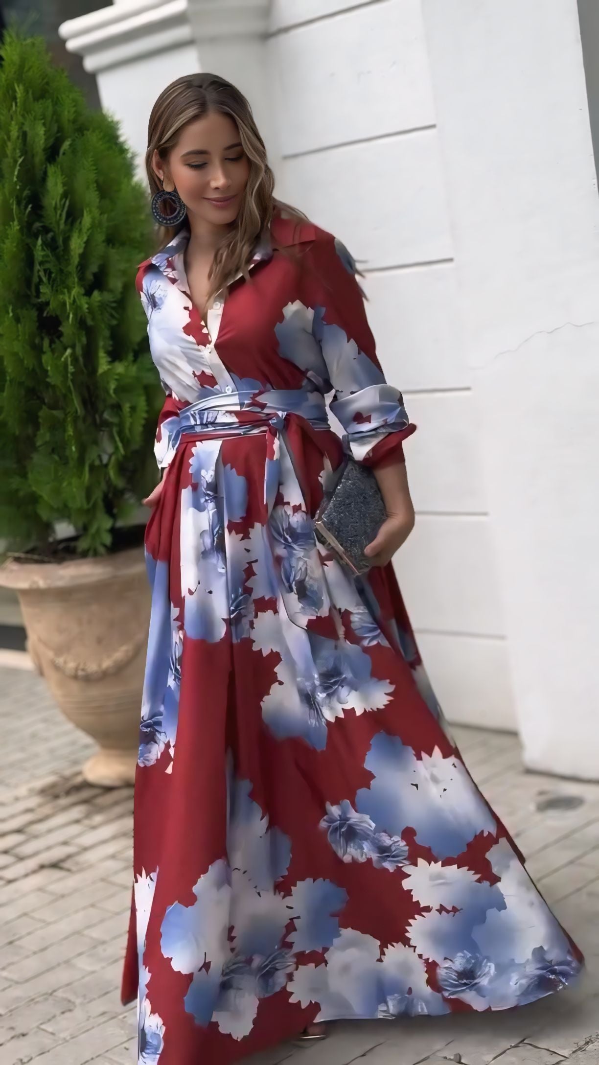 Make a bold and elegant statement with this Luxe Floral Print Belted Maxi Shirt Dress. Featuring a stunning blend of deep red and soft blue florals, this dress is designed to exude sophistication and charm. The classic button-down front, structured collar, and cinched waist with a matching belt create a flattering silhouette, while the flowy full-length skirt adds a touch of effortless grace.